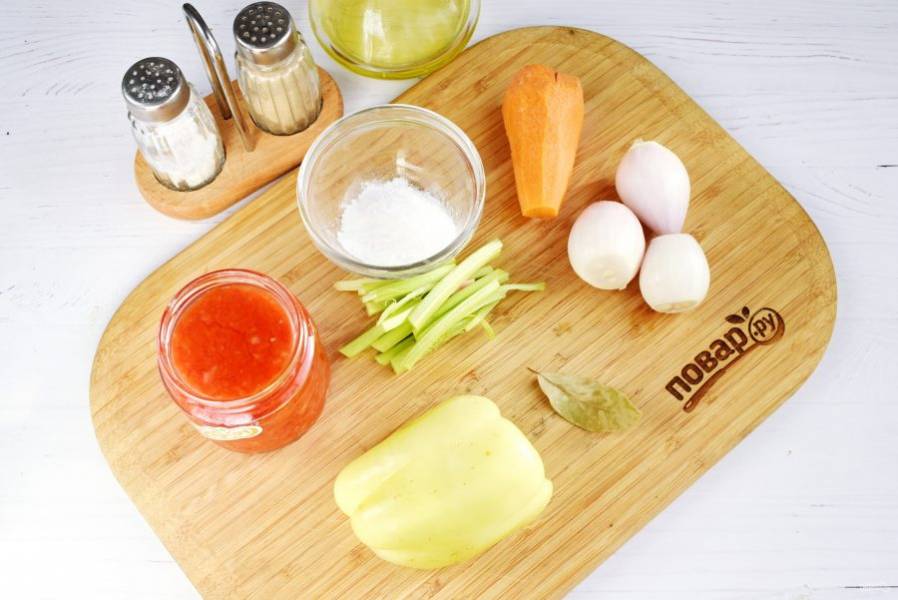 Лук нарежьте полукольцами, морковь, сельдерей и перец - кубиками. В сковороде разогрейте оливковое масло. Обжарьте овощи до золотистого цвета.
