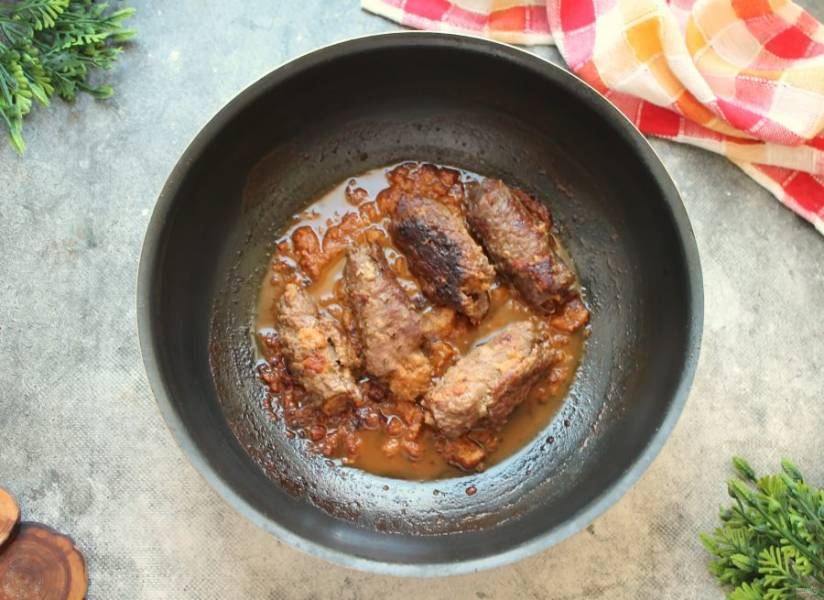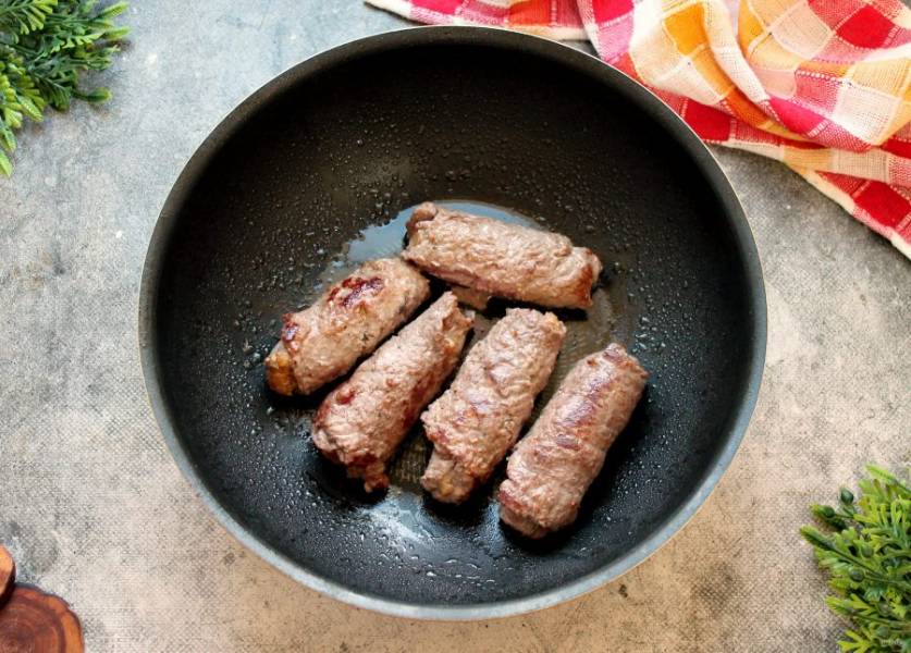 В сковороду налейте растительное масло и разогрейте на сильном огне. Выложите рулетики швом вниз и обжарьте со всех сторон до румяной корочки.