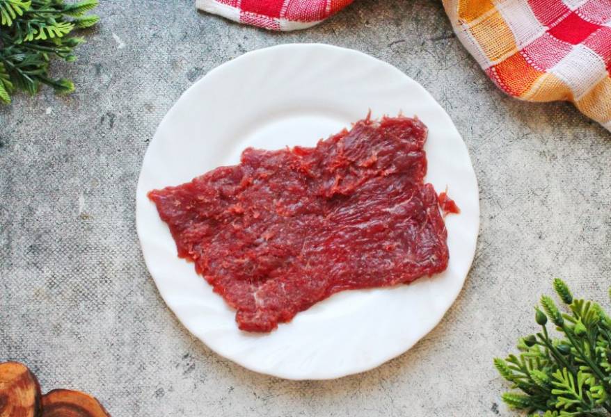 Говядину зачистите от пленок и порежьте поперек волокон на широкие пластинки. Отбейте с двух сторон.