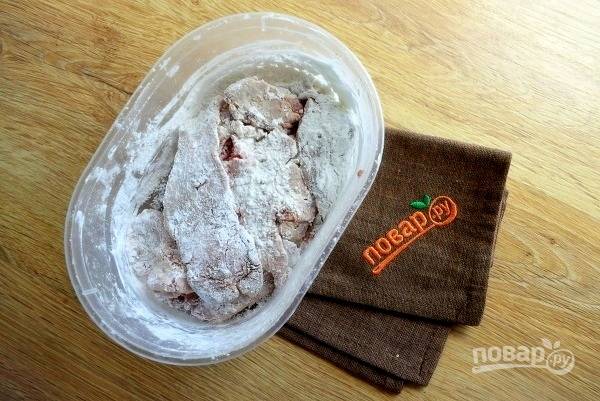 Ломтики мяса обваляйте в крахмале.