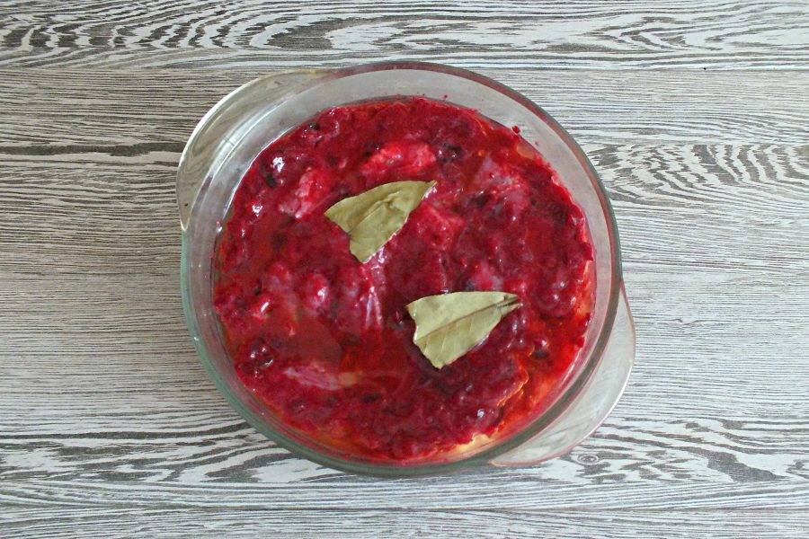 Залейте говядину подготовленным клюквенно-маслянным соусом. Подсолите по вкусу. Добавьте лавровый лист. Поставьте в разогретую до 180 градусов духовку на 2 часа 15 минут.