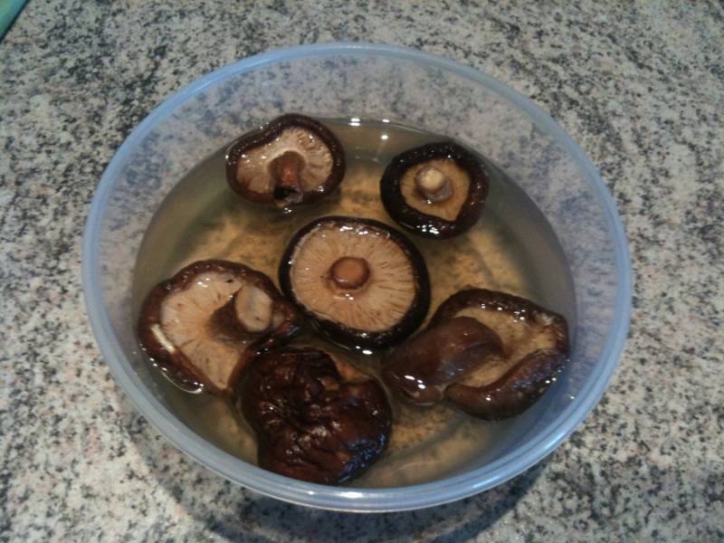 Грибы шиитаке промыть и замочить в горячей воде на 10 минут.