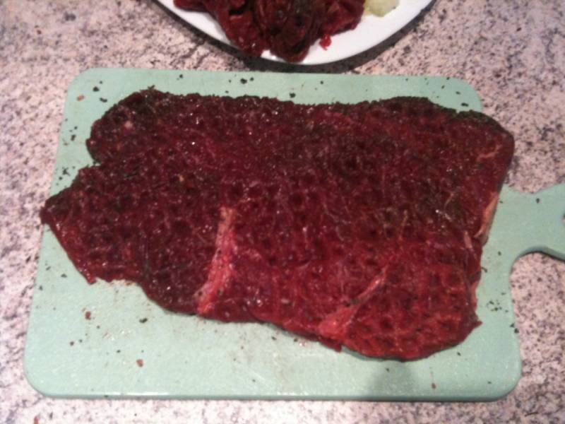 Говядину тонко отбить, посолить и поперчить, нарезать на небольшие кусочки.