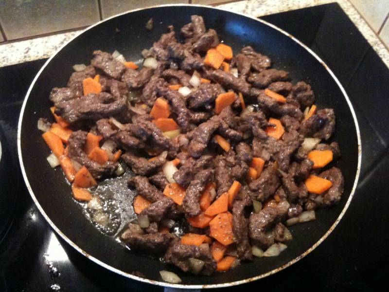 В сковороде обжарить говядину на быстром огне до образования корочки. Затем добавить мелко нарезанные лук и морковь, уменьшить огонь и жарить 10-15 минут. По истечении этого времени добавить отваренные и нарезанные грибы шиитаке, перемешать и готовить на медленном огне до полной готовности мяса.