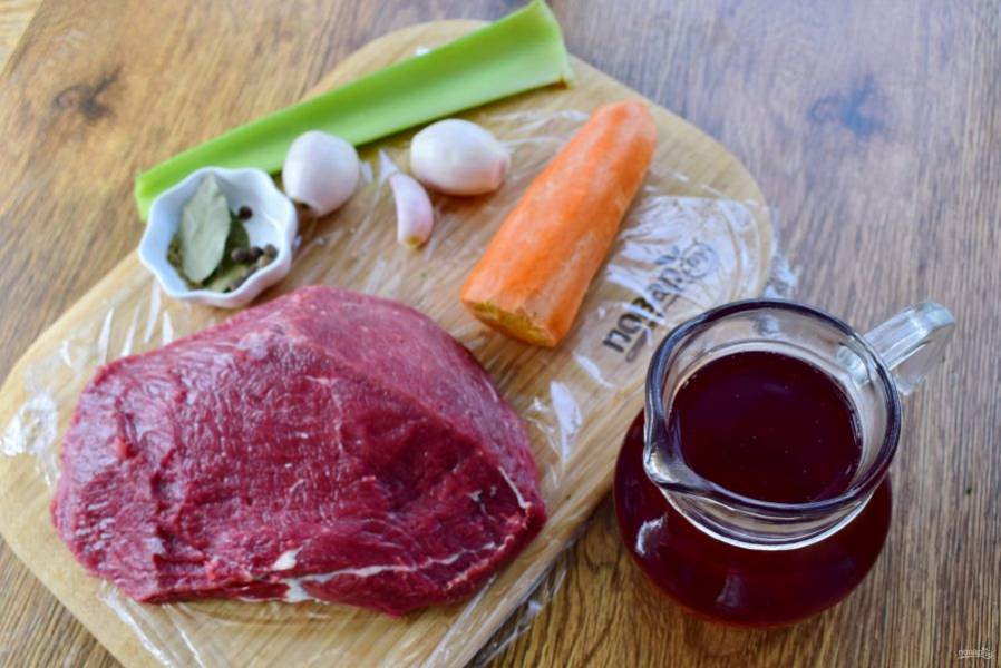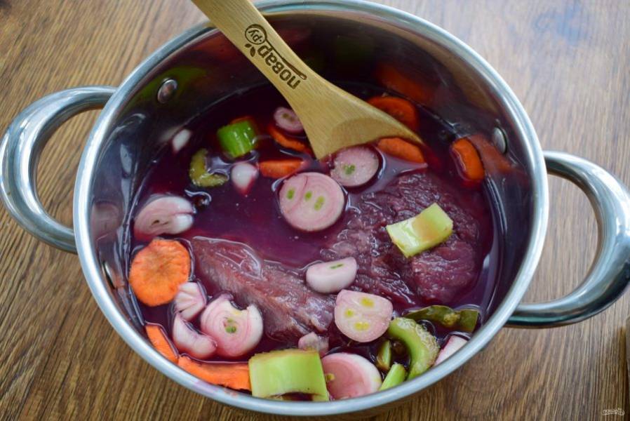 Вино со специями доведите до кипения, остудите до комнатной температуры. Залейте говядину, вино должно полностью покрывать мясо. Добавьте крупно нарезанные овощи, соль, накройте крышкой. Поставьте в холодильник на 7-8 часов.