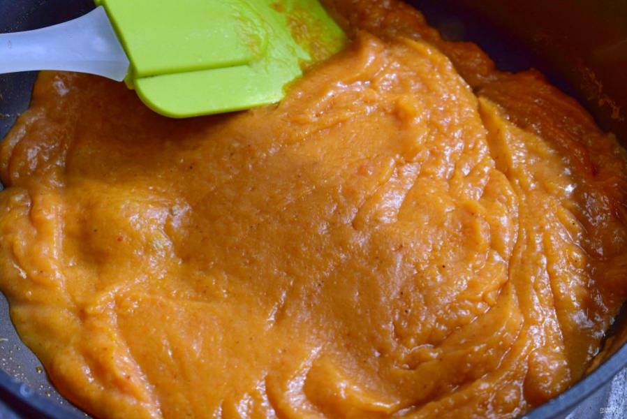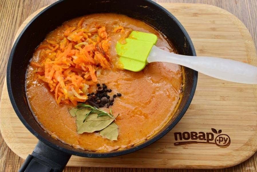 Добавьте томатный соус. Вливайте горячий мясной бульон понемногу (1 стакан), перемешайте до однородности.