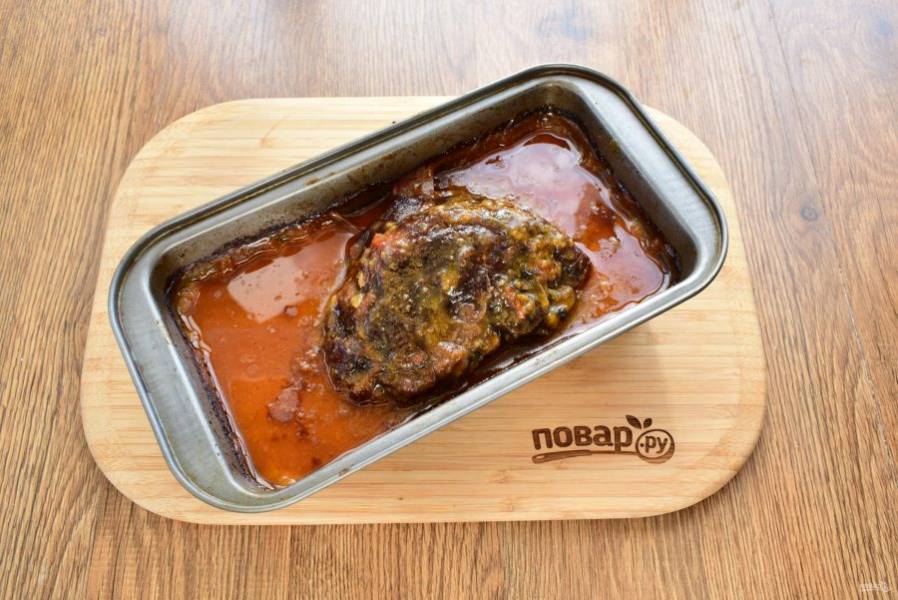Снимите кулинарную нить, переложите на блюдо. До подачи держите в теплом месте. Для подачи разрежьте на порционные ломтики, полейте соусом. Приятного аппетита!
