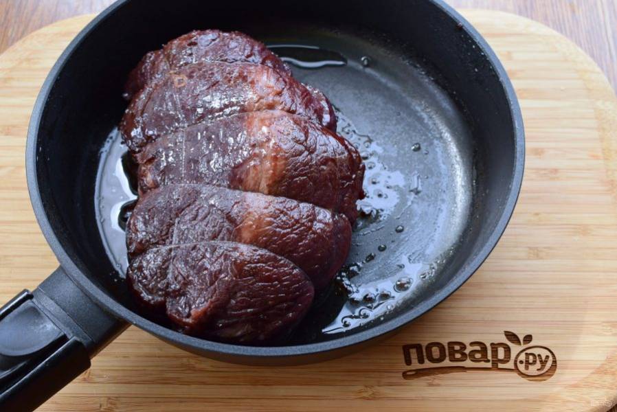 Мясо тщательно обсушите, перевяжите кулинарной нитью. Маринад с мяса процедите, овощи выбросьте. Мясо обжарьте на разогретом оливковом масле со всех сторон до румяной корочки.