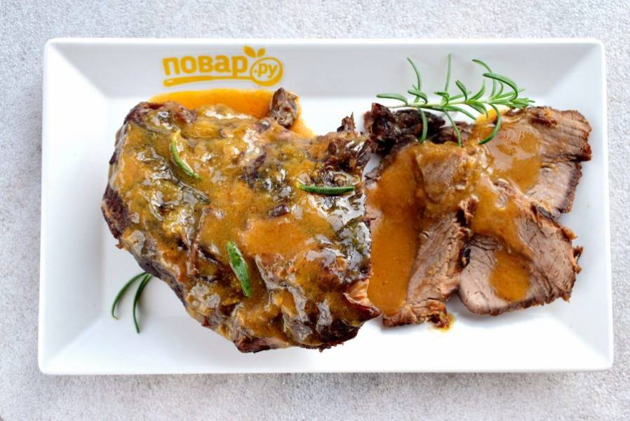 Мясо поместите в жаропрочную посуду. Соус и процеженный маринад соедините, залейте мясо на 2/3. Накройте крышкой или фольгой. Поставьте в разогретую до 180 °С духовку на 2 часа. Затем снизьте температуру до 160 °С и запекайте еще 1 час. Мясо во время запекания периодически поливайте соусом, переверните пару раз.