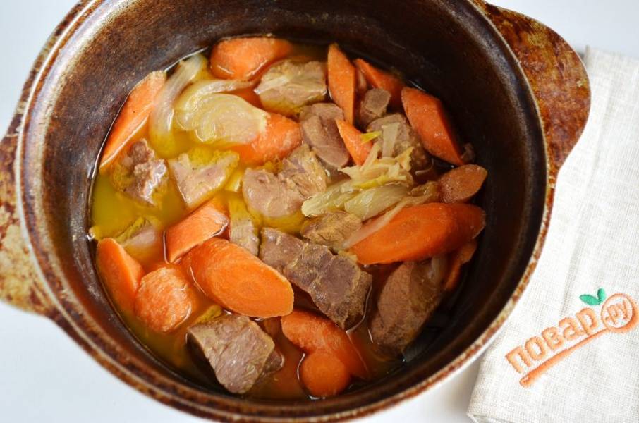 5. В казан или огнеупорную керамическую кастрюлю положите овощи и мясо. Залейте соусом, перемешайте. Откорректируйте на соль. Закройте казан крышкой и поставьте в горячую духовку на 4 часа томиться при температуре 130 градусов.