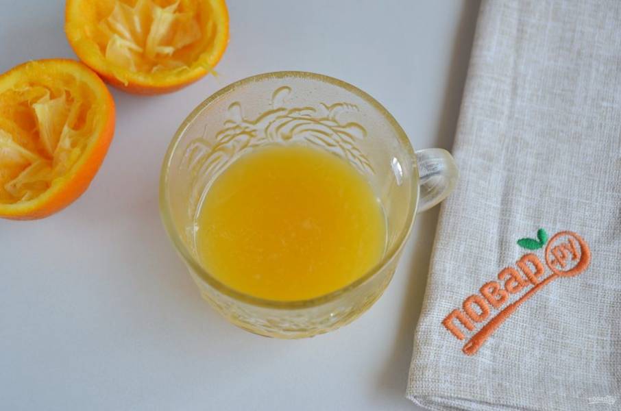 2. Вымойте апельсин, порежьте на две половинки и отожмите сок. Процедите от косточек.