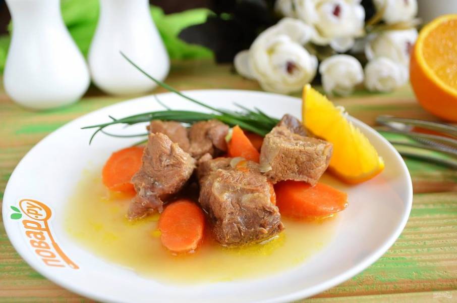 Нежнейшая говядина с кусочками моркови, лука и чеснока в ароматном соусе на основе сливочного масла, апельсинового сока и белого вина. Из специй предлагаю добавить карри и корицу. Смотрите!