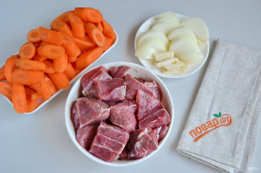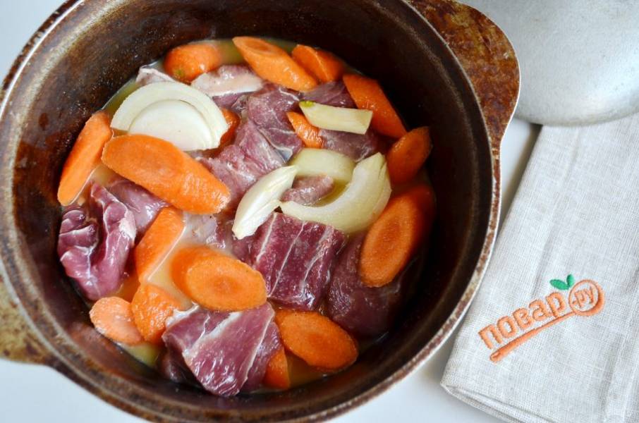 3. Говядину порежьте крупными кусочками. Поперчите, посолите. Очищенные овощи также порежьте крупно.