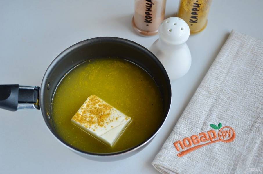 4. В сотейнике соедините сливочное масло, вино и апельсиновый сок. Добавьте корицу и карри. Прогрейте соус, чтобы растаяло масло.