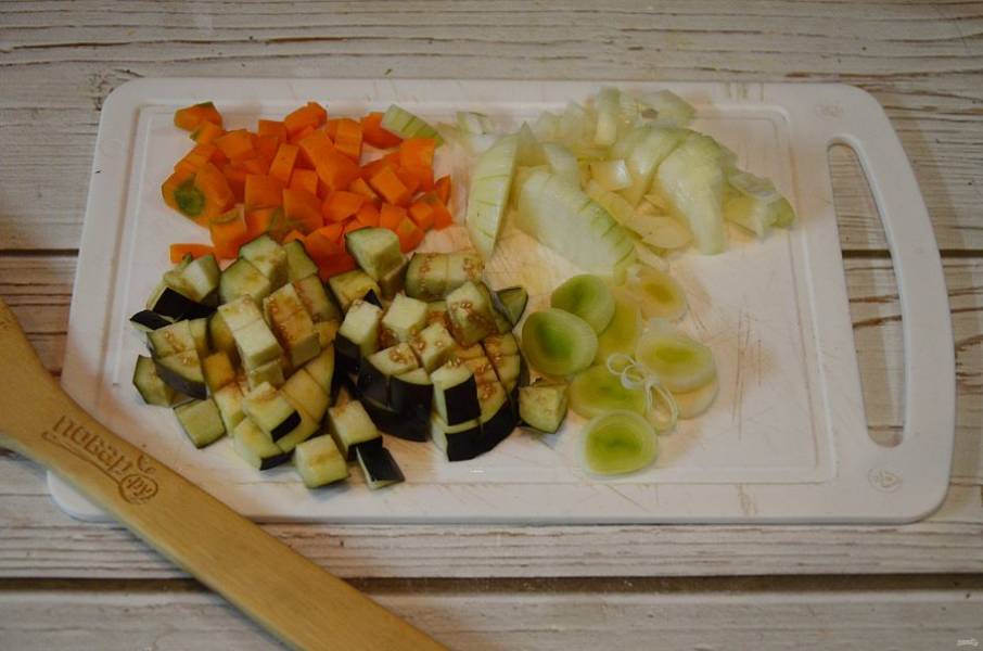 2. Морковь, лук и баклажан нарежьте кубиками, порей - колечками, чеснок порубите.