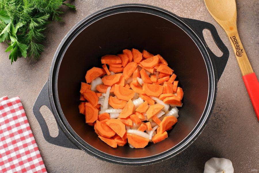 Для приготовления лучше всего использовать сковороду с толстым дном или казан. Налейте масло, раскалите его и выложите нарезанные произвольно лук и морковь.
