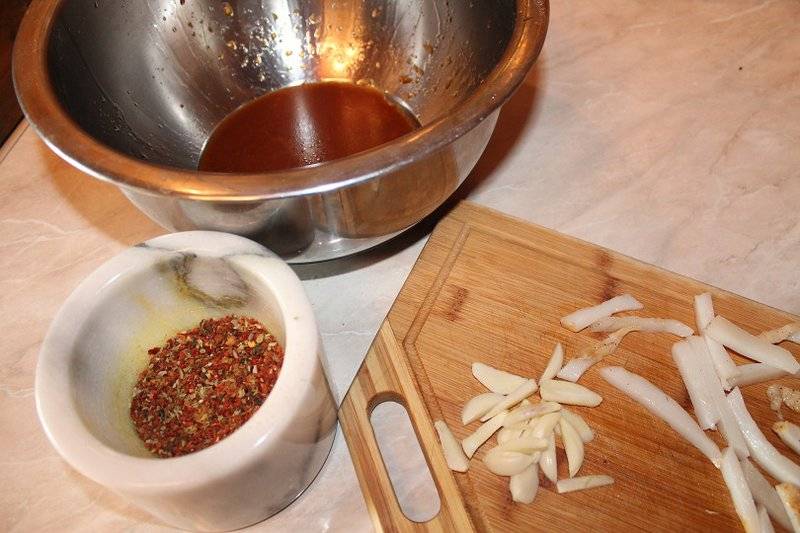 Для начала приготовим маринад: смешиваем в миске оливковое масло, уксус и горчицу, добавляем все специи, каждой буквально по щепотке. Затем нарезаем на небольшие кусочки сало и чеснок.