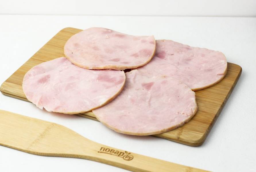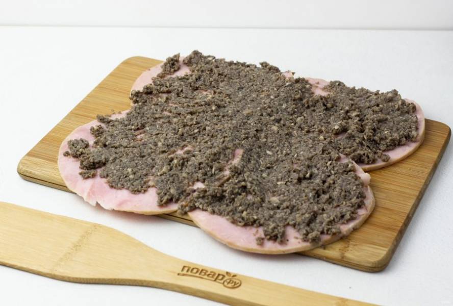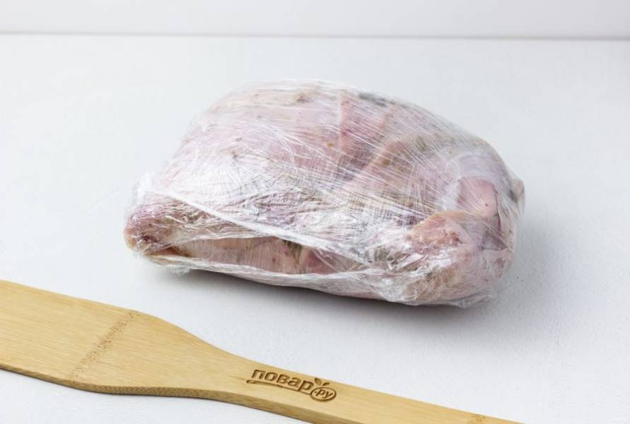 В середину кладем говядину и оборачиваем ее ветчиной. Всё это дело туго обматываем пищевой пленкой и убираем в холодильник на 20 минут.