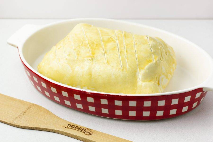 Заверните мясо в тесто. Все швы и всю поверхность теста тоже нужно смазать желтком.