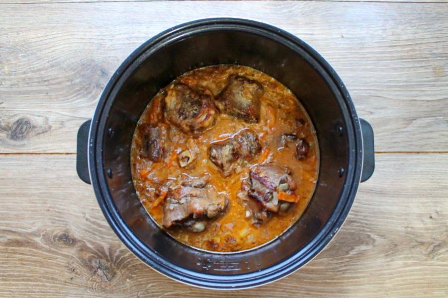 Закройте крышку мультиварки и установите время три часа и режим "Тушение".