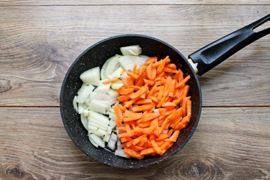 Морковь и репчатый лук почистите. Лук разрежьте на четыре части, а затем тонко порежьте. Морковь порежьте крупной соломкой. В сковороду налейте 1 столовую ложку растительного масла, выложите порезанные овощи и обжарьте на среднем огне в течение 10 минут.