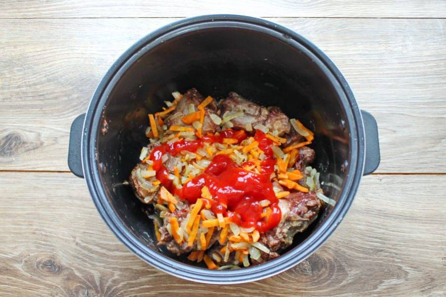 Переложите обжаренные овощи в чашу мультиварки на обжаренные хвосты.