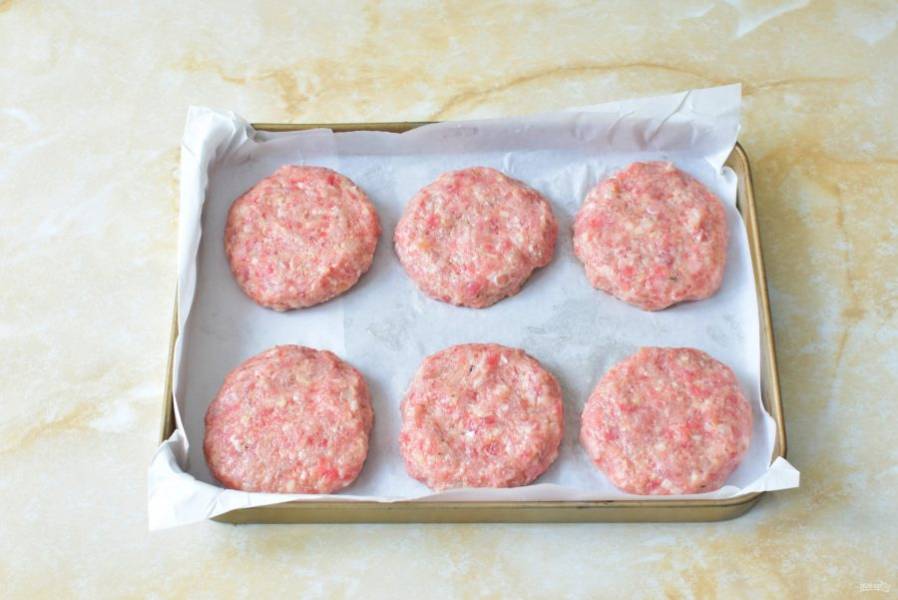 Все ингредиенты тщательно смешайте до однородности. Готовую мясную массу отбейте о дно чаши, чтобы сделать её плотнее. Благодаря этому котлеты не будут разваливаться при запекании.
