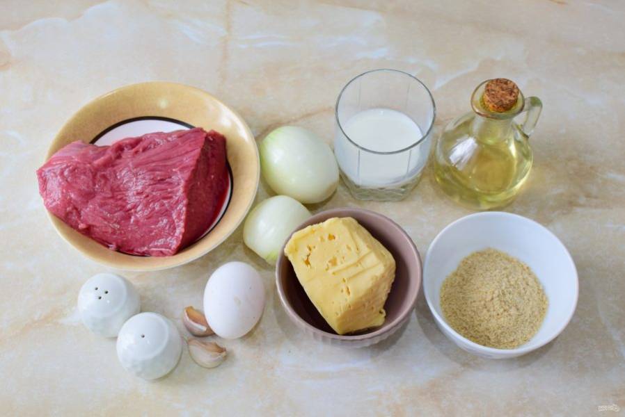 Для приготовления котлет подготовьте необходимые ингредиенты. Мясо говядины выбирайте без костей. При необходимости удалите все прожилки.