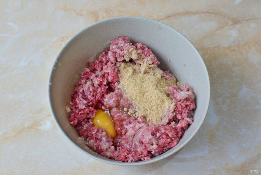 Разбейте в фарш яйцо. Добавьте панировочные сухари.