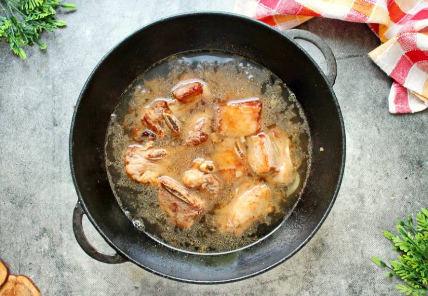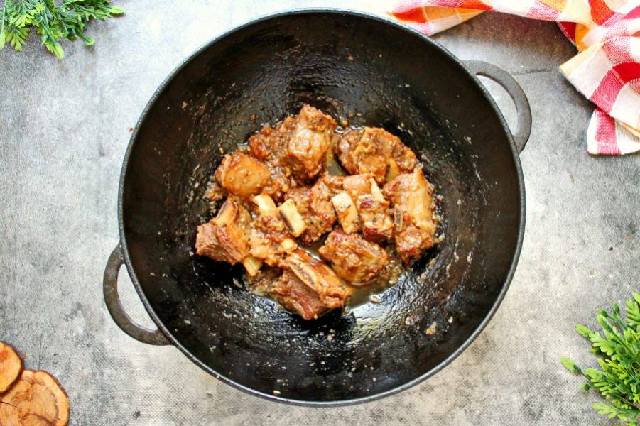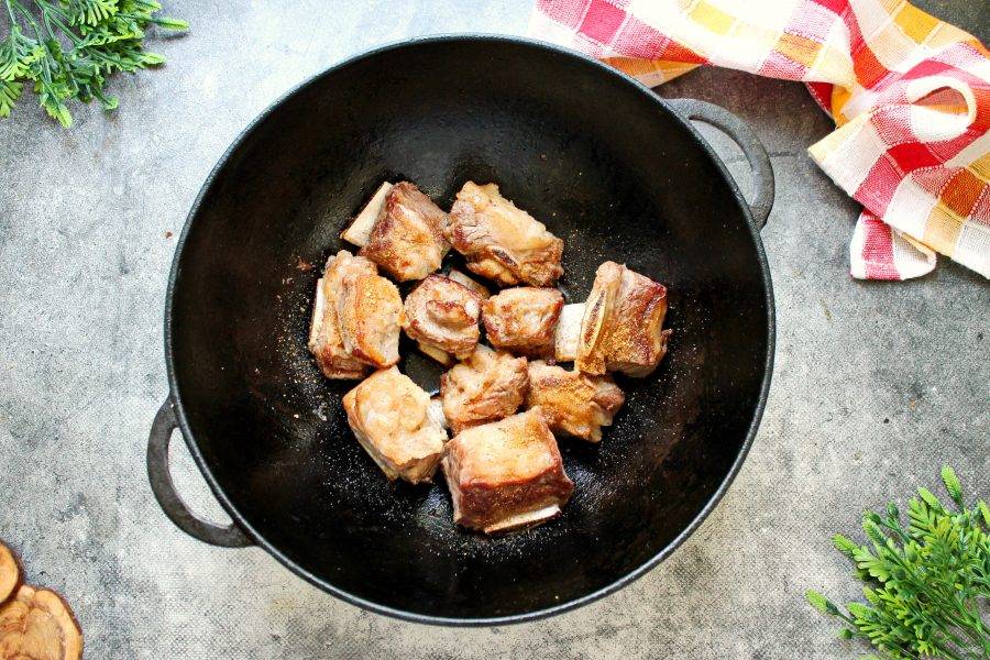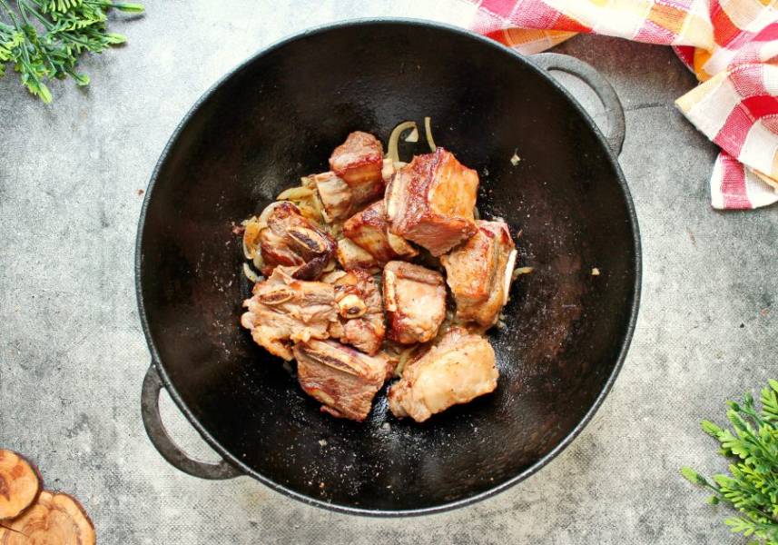 Верните в казан обжаренные ребрышки, посолите, поперчите и перемешайте, обжарьте еще одну минуту.