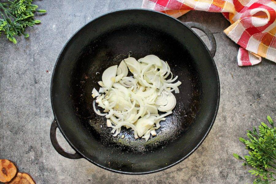 Репчатый лук порежьте полукольцами и выложите в казан после обжарки мяса.