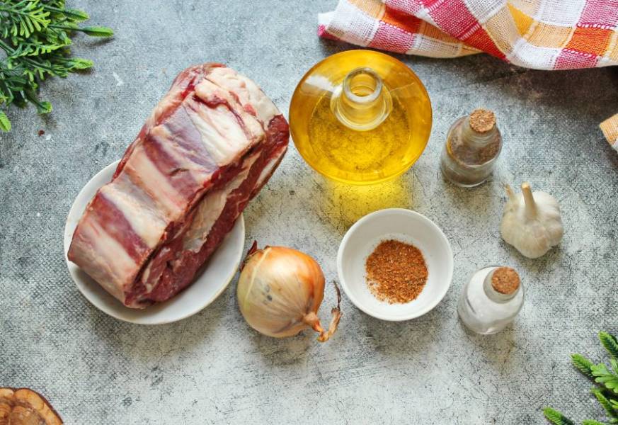 Подготовьте все необходимые ингредиенты для приготовления говяжьих ребрышек в казане с луком. Ребра сполосните и обсушите. Репчатый лук и чеснок почистите, сполосните.