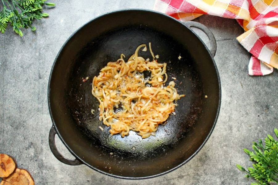 Убавьте огонь до среднего и обжаривайте лук в течение 6-7 минут, перемешивая.