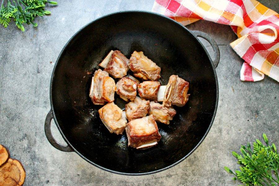 Поставьте казан на сильный огонь и влейте растительное масло, разогрейте. Говяжьи ребрышки разрежьте на части и выложите в казан. Обжарьте их до золотистого цвета со всех сторон, перемешивая.