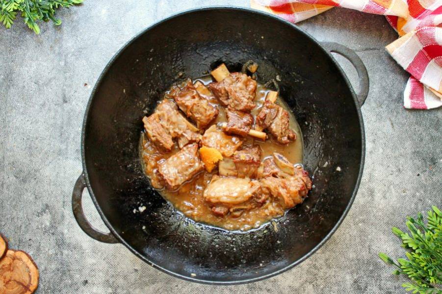Закройте казан крышкой, убавьте огонь до медленного и томите ребрышки с луком в течение 1.5-2 часа. Ребрышки должны стать мягкими, а лук почти раствориться.