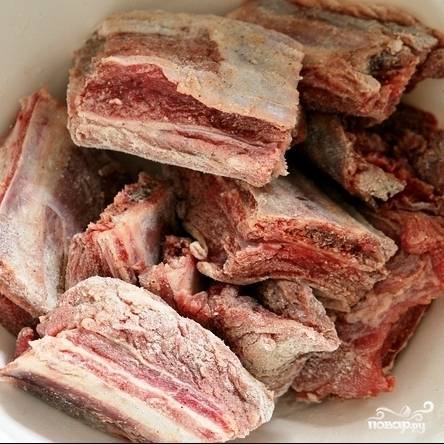 Говяжьи ребра промываем, разрезаем по отдельности на ребрышки, даем им обсохнуть.