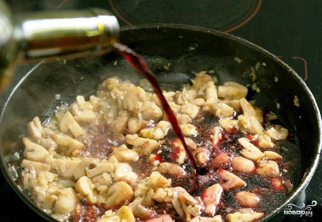 Затем вливаем в сковороду к грибам вино и полстакана бульона (если бульона нет - простой кипяченой воды).