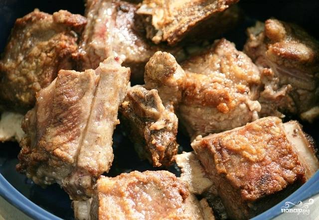 Обжариваем ребрышки на сильном огне до образования румяной корочки.