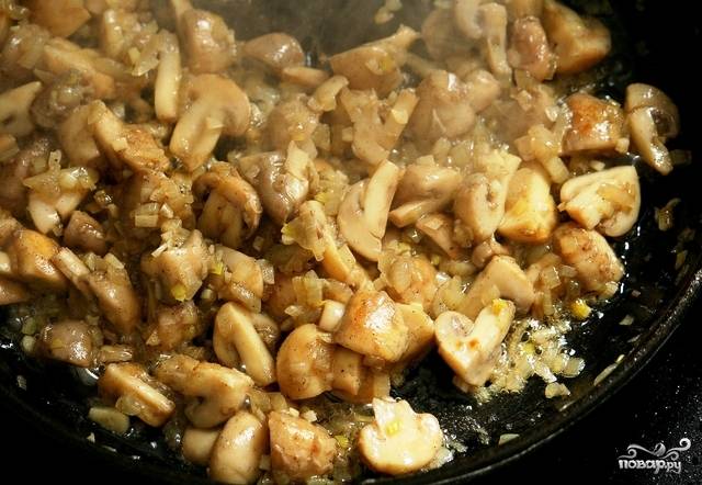 Когда лук и чеснок станут прозрачными (на это уйдет 2-3 минуты), добавляем в сковороду на четвертины нарезанные шампиньоны. Жарим, помешивая, около 10 минут.