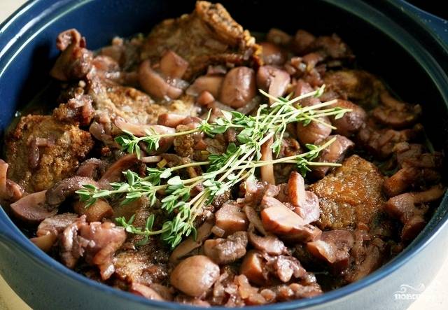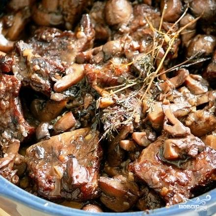 Доводим до кипения, после чего снимаем с огня и выливаем все содержимое сковороды на говяжьи ребрышки. Туда же бросаем пару веточек свежего тимьяна.