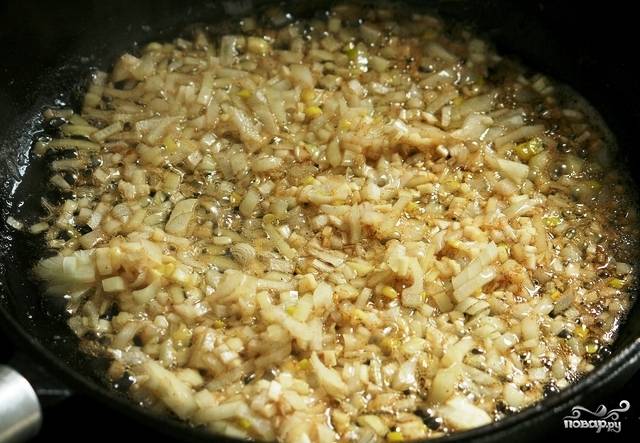 В том же масле, в котором обжаривалось мясо, обжариваем мелко нарезанные лук и чеснок.