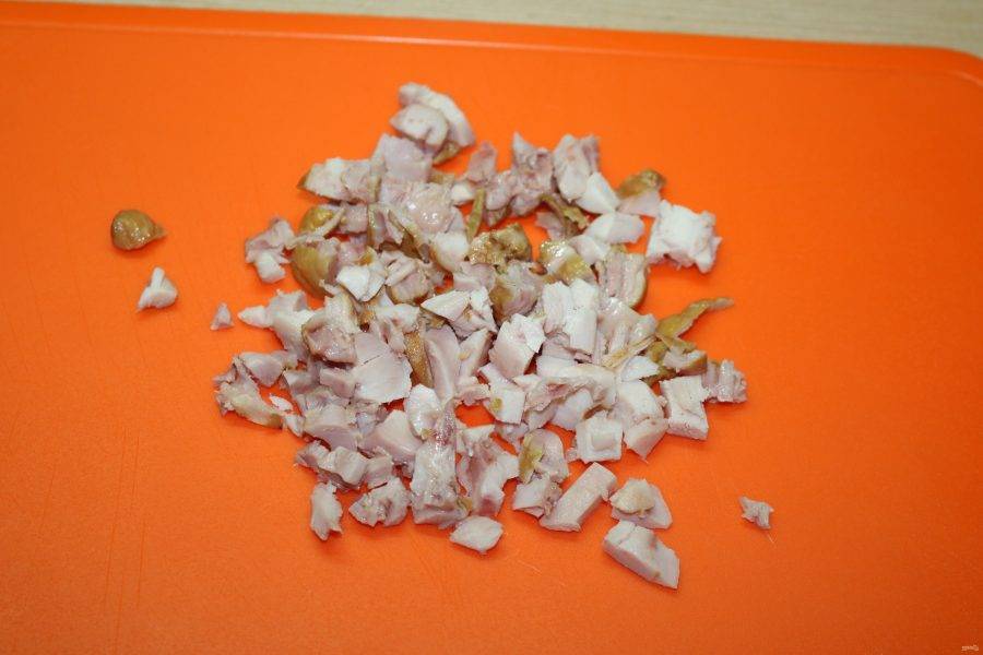 Куриное бедро нарежьте небольшими кубиками.