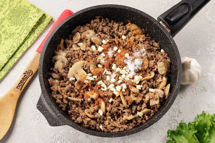 Затем добавьте нарезанный мелкими кубиками чеснок, соль и специи по вкусу. Готовьте ещё около 5 минут.