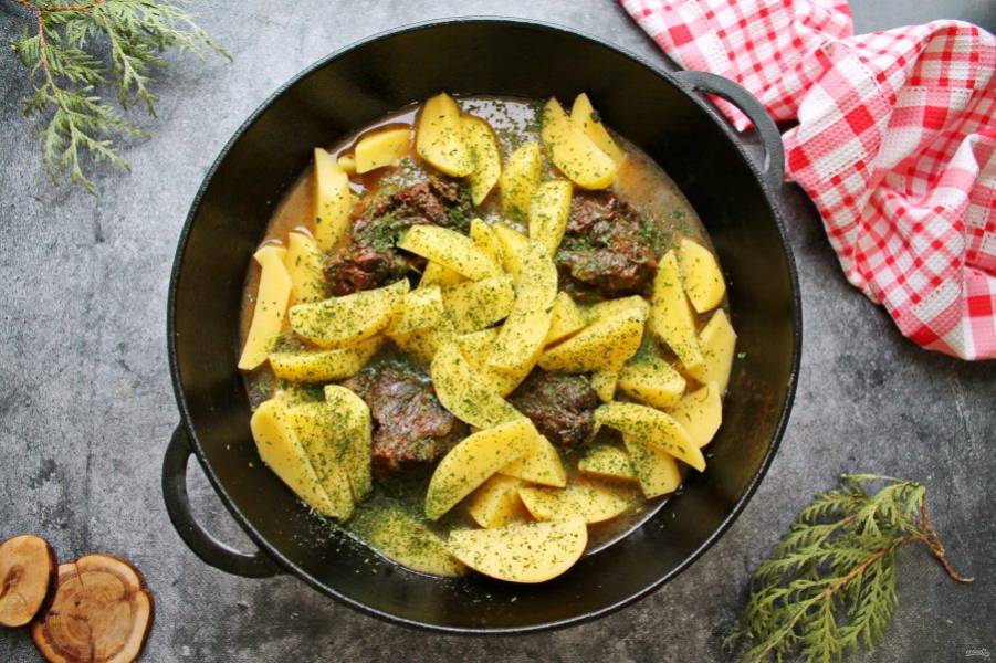 Картофель почистите, сполосните и порежьте его дольками. Выложите картошку в казан с хвостом. Посыпьте зеленью, поперчите и долейте воды в уровень продуктов. Готовьте еще 15-20 минут до готовности картофеля.