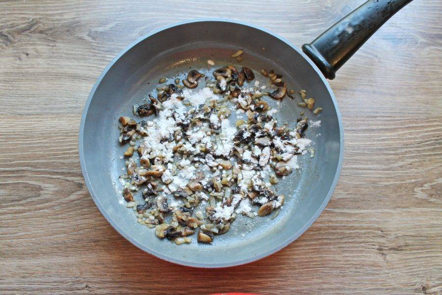 Посыпьте обжаренные грибы мукой и перемешайте. Обжаривайте в течение 2 минут.