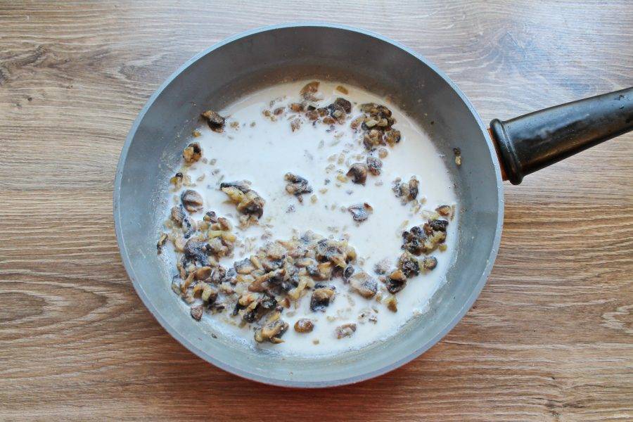 Перемешивая, влейте теплое молоко, посолите и поперчите.