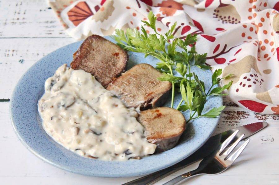 Варите соус на медленном огне в течение 2-3 минут, до загустения. Выложите язык на тарелки, полейте грибным соусом и подавайте к столу.