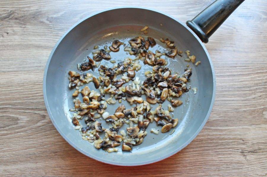 Шампиньоны протрите влажной тряпочкой и удалите загрязненные места. Порежьте грибы на тонкие дольки. Выложите их в сковороду с луком.