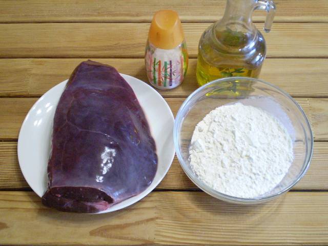 1. Приготовим свежую печень, муку, масло для жарки и соль. Печень лучше немного подморозить, так она легче будет нарезаться и меньше стекать кровью на сковороде.