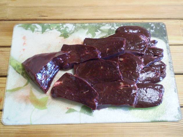 2. Мерзлая печень прекрасно режется, я порезала на кусочки толщиной до 1 см. Если печень старая, то лучше чуточку отбить её молоточком через пленку. Посолить со всех сторон.